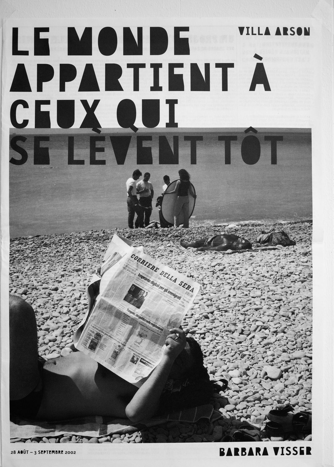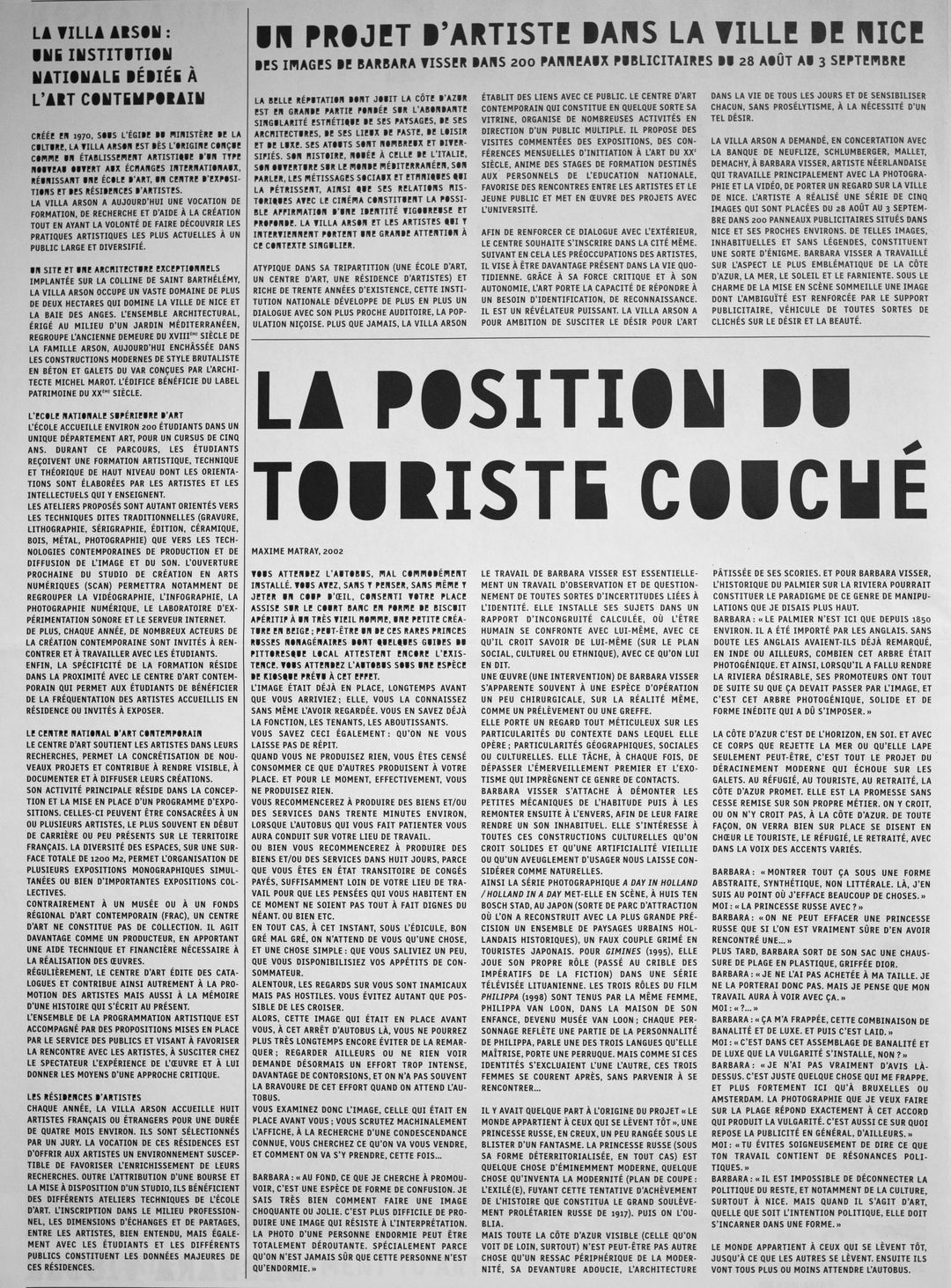 One of two newspapers related to the series of posters originally made for the publicity panels of Nice, France in 2001, on invitation of Villa Arson, Nice. The English version was made in relation to the exhibition Haunted by Detail by the curatorial program at De Appel in 2002.